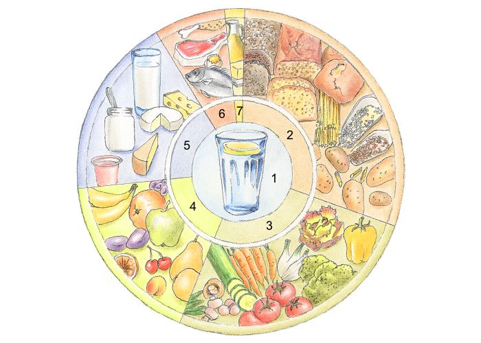 Neben der Lebensmittelpyramide gibt es den sogenannten Ernährungskreis (siehe Abbildung 2), der in der Schweiz nicht sehr bekannt ist und wegen seiner Angaben zur Zusammenstellung der Lebensmittel auch nur schwierig im Alltag umgesetzt werden kann. Dabei handelt es sich um ein Schema, in dem die verschiedenen Lebensmittelgruppen entsprechend ihrem empfohlenen Anteil an einer gesunden Ernährung im Kreis angeordnet sind. So sollten etwa 30% der täglichen Nahrungszufuhr Getreide, Getreideerzeugnisse und Kartoffeln sein, etwa 26% Gemüse, Salat und Hülsenfrüchte und etwa 17% Obst. Damit bestehen etwa 75% der täglichen Nahrungszufuhr aus Pflanzen. Etwa 18% der täglichen Nahrung sollten Milch und Milchprodukte sein, etwa 7% Fleisch, Wurst, Fisch und Eier und etwa 2% Fette und Öle. Zusätzlich zur Nahrungsmittelzufuhr muss dem Körper auch täglich genügend Flüssigkeit gegeben werden. Täglich sollte ein erwachsener Mensch mindestens 1,5 Liter trinken, was in der Mitte des Kreises dargestellt wird.