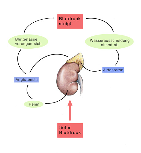 Wenn die Nieren weniger stark als erwartet durchblutet werden, schütten sie das Hormon Renin aus, das über mehrere andere Hormone eine Blutdruckerhöhung bewirkt. Durch die selben Hormone werden die Nieren auch dazu angeregt weniger Wasser auszuscheiden, was zu einer Zunahme des Blutvolumens führt und damit ebenfalls zu einem Blutdruckanstieg. Die nebenstehende Skizze verdeutlicht diesen Regulationskreislauf der Nieren.