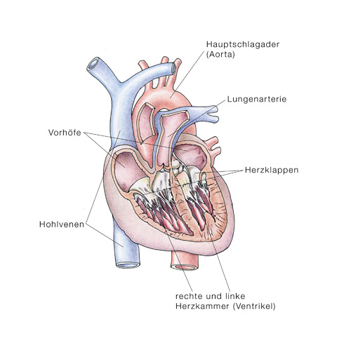 Die Hauptaufgabe des Herzens besteht darin, das von der Lunge mit Sauerstoff angereicherte Blut zurück in den Kreislauf zu pumpen. Das Blut wird dabei vom Herz in die Hauptschlagader, auch Aorta genannt, gepumpt. Von dieser Hauptschlagader gehen alle Gefässe ab, welche nach weiterer Verzweigung den Körper mit Blut versorgen. Damit das Blut, nachdem es einmal in den Körperkreislauf gepumpt worden ist, nicht mehr ins Herz zurückfliessen kann, befindet sich am Übergang vom Herz zur Hauptschlagader eine Klappe (Aortenklappe), welche nur in einer Richtung durchgängig ist. Wenn das Herz Blut in den Kreislauf pumpt geht sie auf, und verschliesst sich nach jedem Herzschlag wieder, damit das Blut nicht wieder zurück ins Herz fliessen kann.