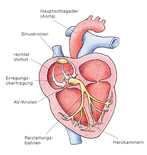 Geregelt wird dies über das autonome Nervensystem. Der Schrittmacher des Herzens heisst Sinusknoten und liegt im rechten Vorhof des Herzens. Von da aus wird das ganze Herz zum Pumpen angeregt. Der Impuls wird, bevor er die Herzkammern erreicht, durch den AV- Knoten geleitet. Dieser hat die Funktion eines Filters oder einer Bremse. Kommen zum Beispiel aufgrund eines Fehlers zwei Herzschläge innerhalb sehr kurzer Zeit beim AV-Knoten an, filtert er den zweiten, unnötigen Herzschlag heraus, damit die Herzfunktion nicht beeinträchtigt wird.