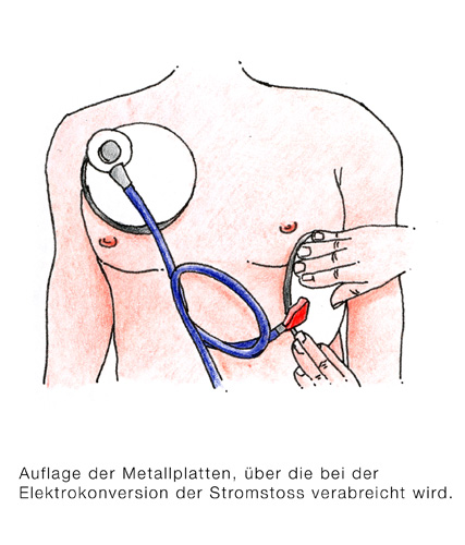 Die Elektrokonversion ist ein Verfahren, bei dem über grosse Platten, die auf den Brustkorb aufgeklebt werden, ein kurzer Stromstoss auf das Herz abgegeben wird. Damit wird der Zustand der Herzmuskelaktivität auf null zurückgesetzt, wonach mit grosser Wahrscheinlichkeit wieder ein normaler Herzrhythmus einsetzen kann. Ist die Therapie beim ersten Mal nicht erfolgreich, wird sie wiederholt.